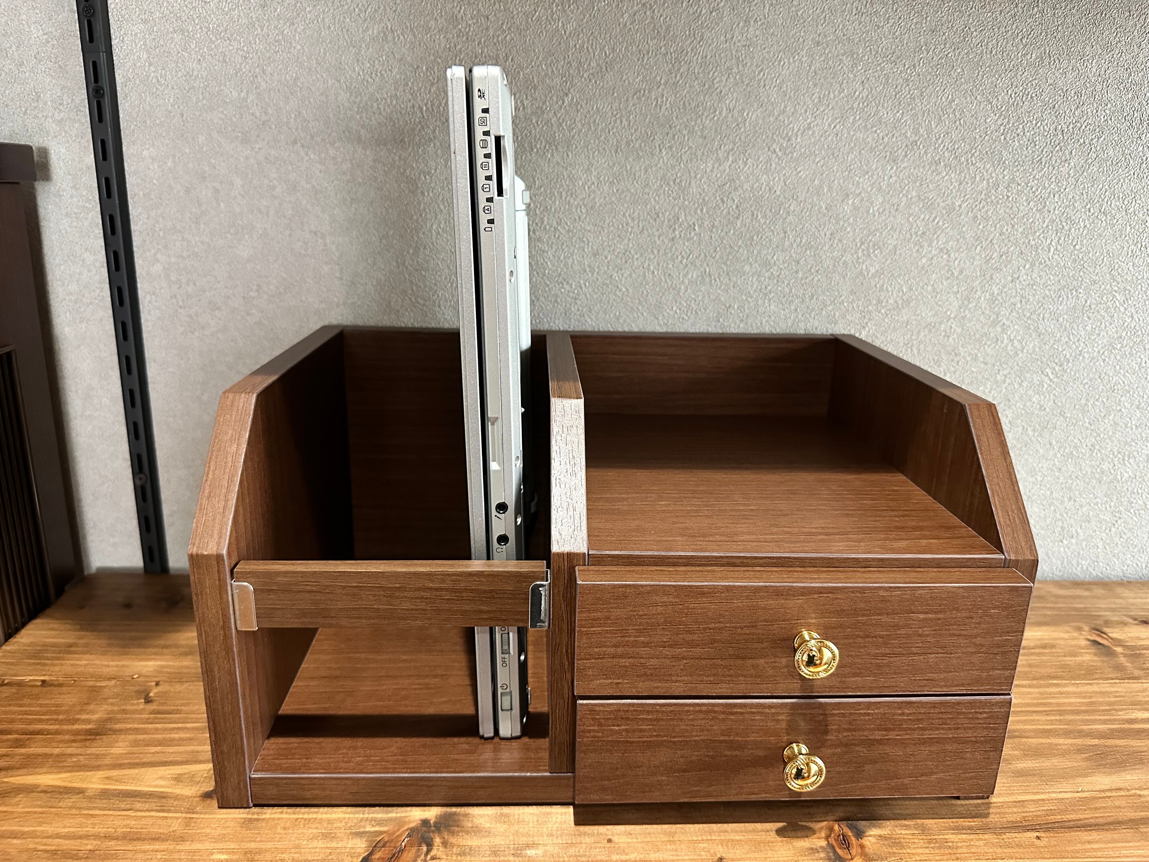 左収納部はA4サイズが入りますので、書類、本、14インチのノートPCが収納可能です。
